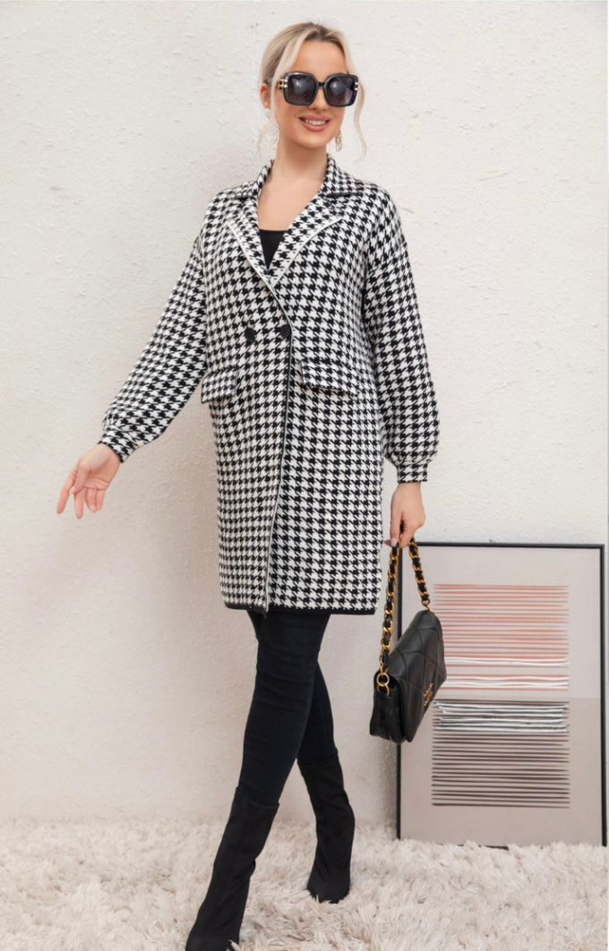 Un clásico que nunca pasa de moda. Este abrigo de corte recto con estampado pata de gallo es perfecto para darle sofisticación a cualquier outfit. Su diseño atemporal en blanco y negro lo convierte en una pieza versátil, ideal para combinar tanto con looks de oficina como con atuendos casuales chic.