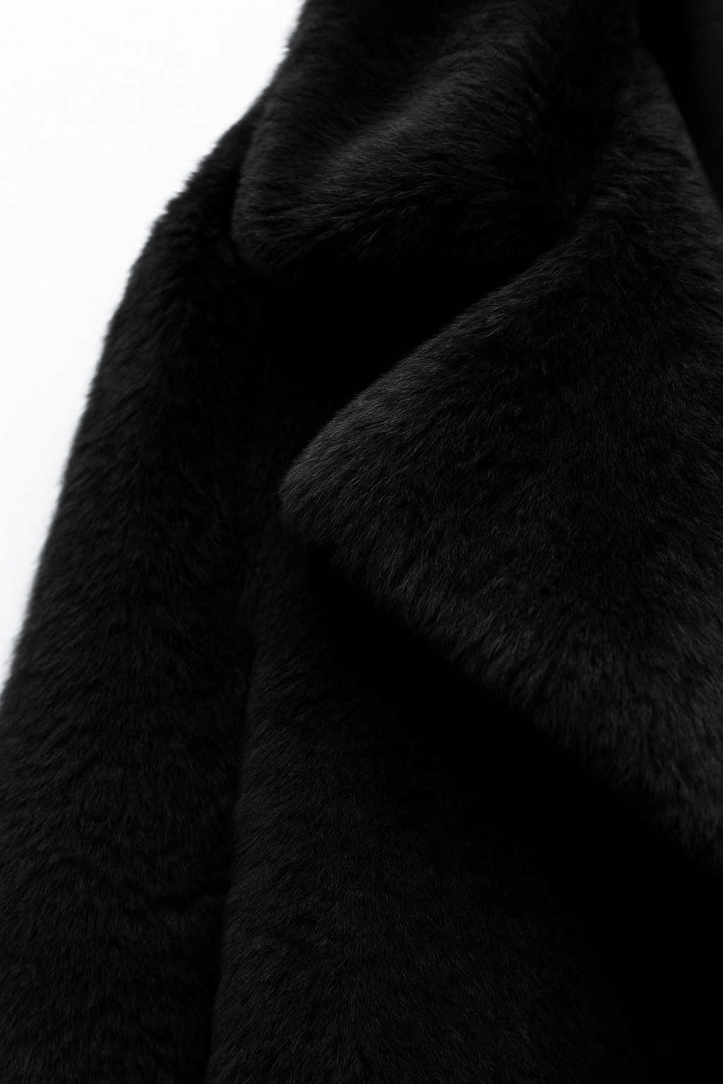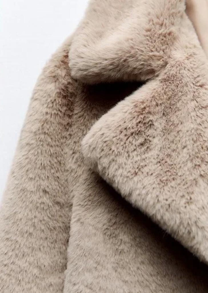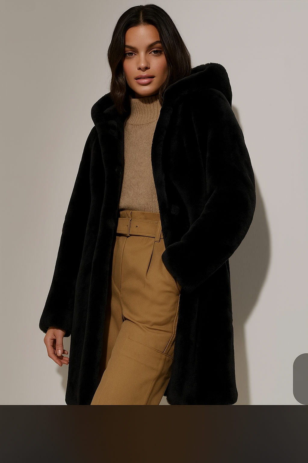 Un abrigo envolvente y elegante confeccionado en suave pelo sintético, ideal para la temporada invernal. Con capucha amplia y cierre frontal con botones, aporta calidez y estilo en cada ocasión. Su tono neutro combina fácilmente con todo tu guardarropa, desde looks casuales hasta atuendos más sofisticados.