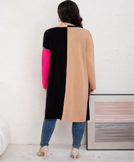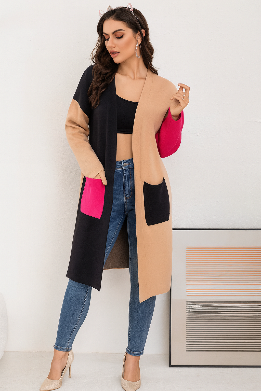 Cardigan abierto de diseño color block en tonos camel, negro y fucsia que combina estilo y confort. Su corte largo y tejido suave lo hacen ideal para looks casuales o de oficina. Perfecto para dar un toque moderno y sofisticado a tu outfit, ya sea con jeans o pantalones formales.