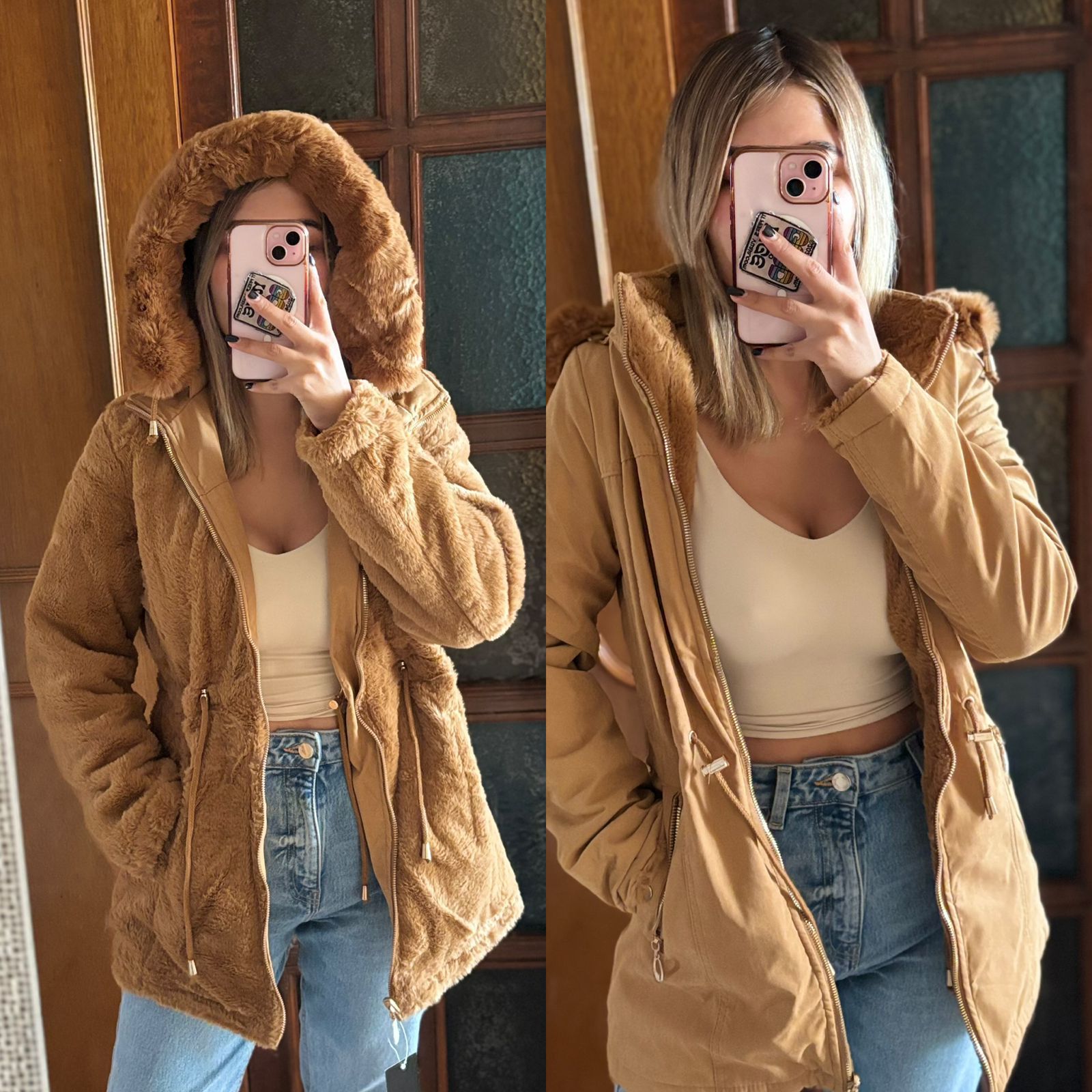 Chamarra doble vista, ideal para el frío. Un lado suave tipo peluche y otro liso para mayor versatilidad. Con capucha, cierre frontal y ajuste en la cintura, combina estilo y comodidad en cualquier ocasión. ¡Perfecta para esta temporada!