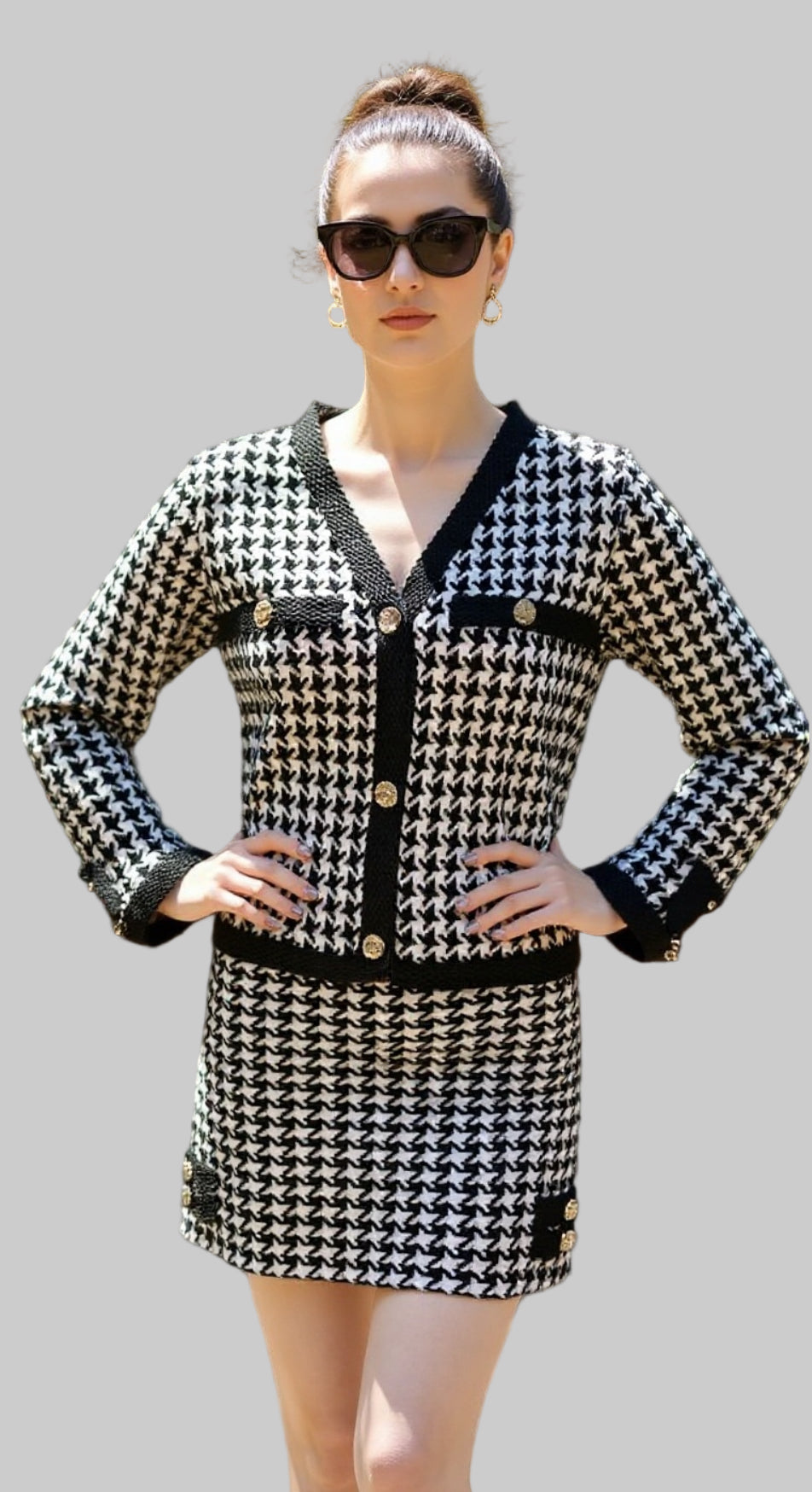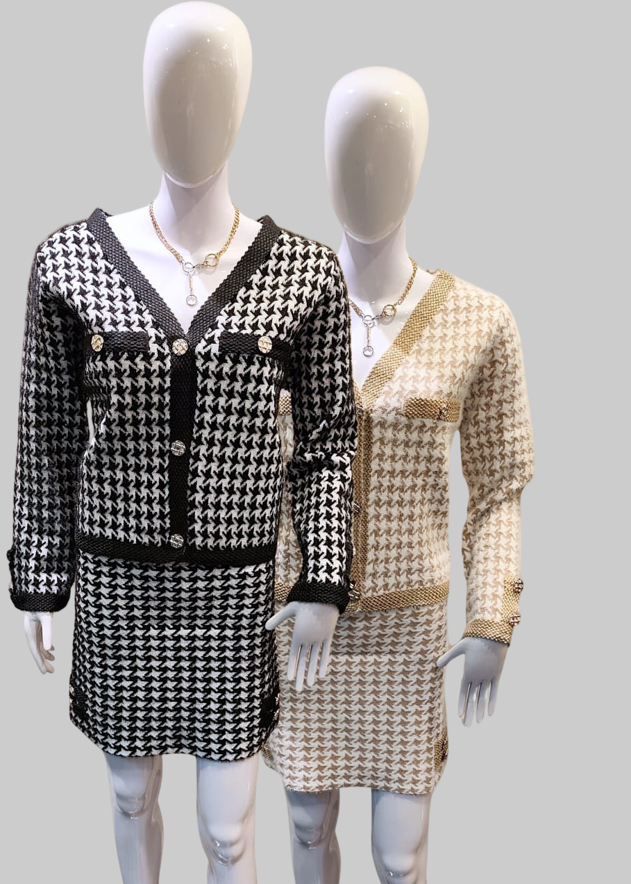 Elegancia clásica con un toque moderno. Este conjunto de falda y saco tipo cardigan está confeccionado en tejido de punto con patrón pata de gallo, detalle de botones decorativos y acabados contrastantes. Su silueta estructurada resalta la figura, creando un look sofisticado y femenino.