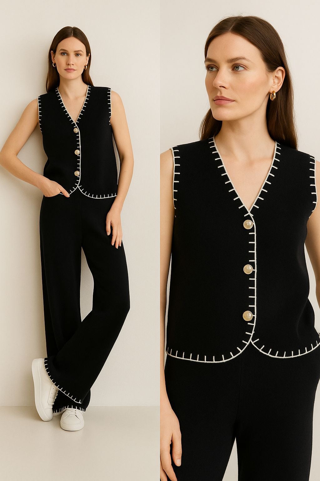 Elegancia y comodidad en un mismo look. Este set de dos piezas combina un chaleco sin mangas con botones nacarados y costuras en contraste, junto a un pantalón de corte recto con detalle en ruedo que completa la armonía del diseño. Ideal para un estilo moderno, minimalista y versátil.