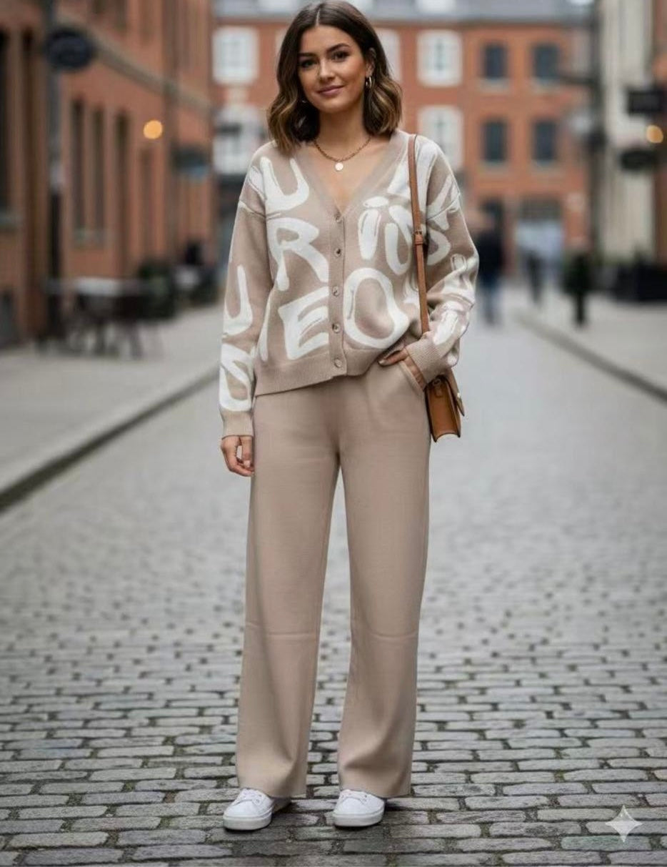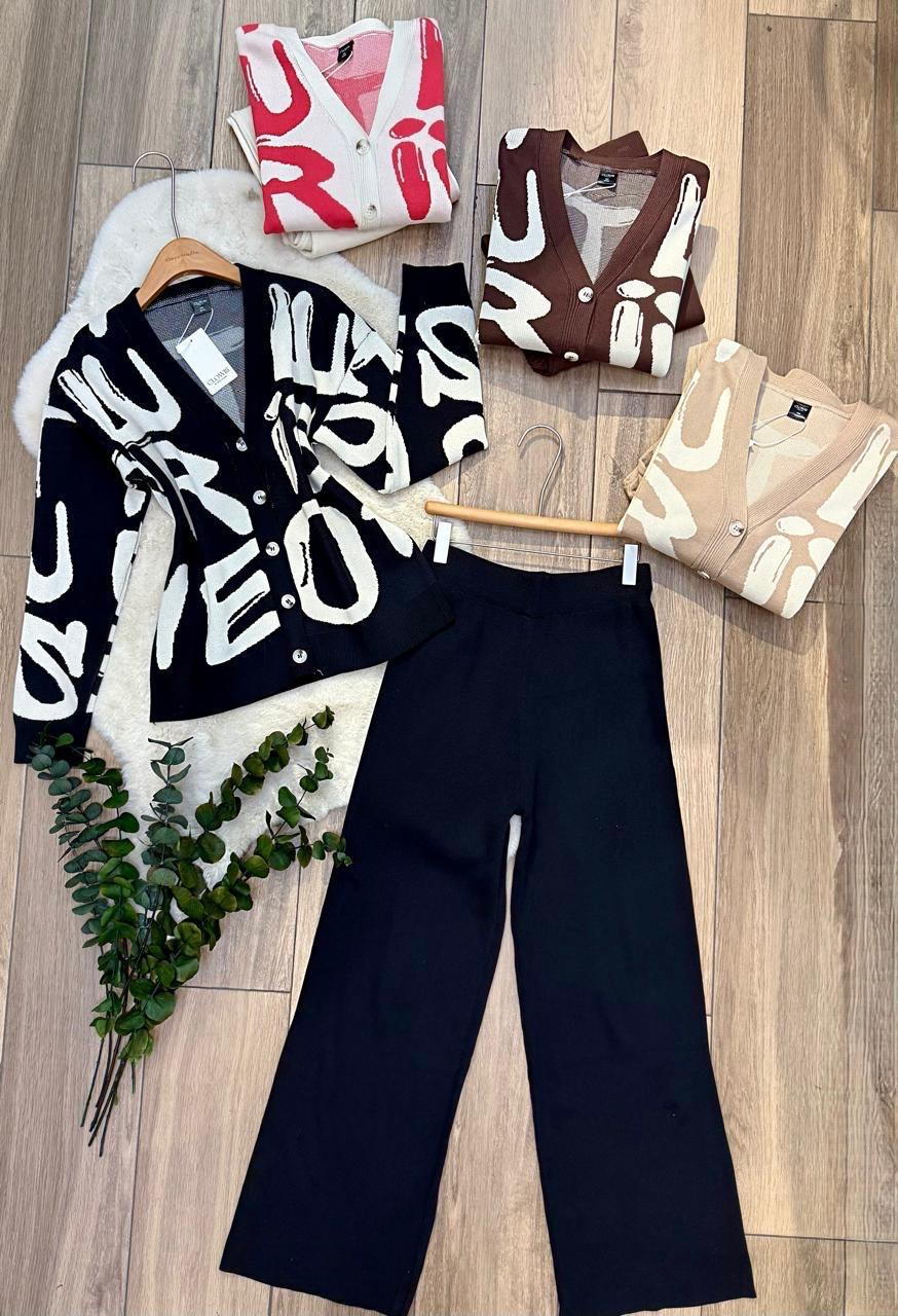 Un cárdigan moderno y versátil que combina comodidad con estilo gráfico. Su diseño de letras en contraste crea un look original y contemporáneo, ideal para elevar cualquier outfit casual o de oficina.