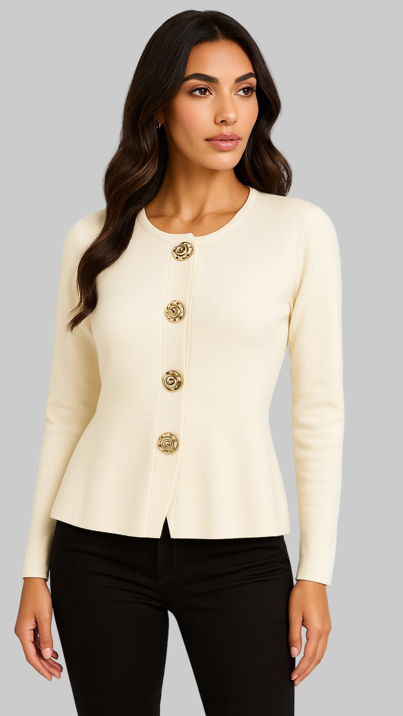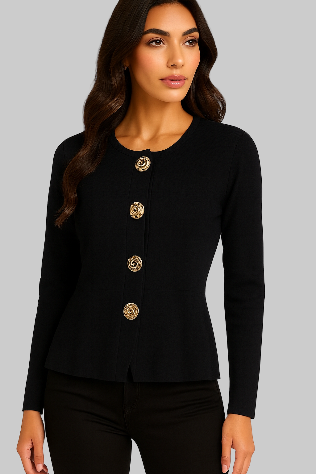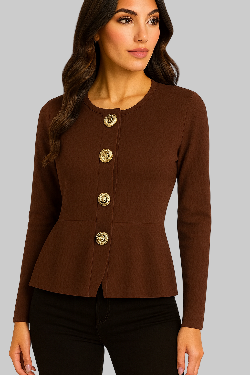 Saco femenino de corte estructurado y silueta favorecedora que resalta la cintura. Confeccionado en tejido suave al tacto, cuenta con botones dorados decorativos que aportan un toque elegante y moderno. Perfecto para combinar con jeans o pantalones de vestir, creando looks sofisticados para el día o la oficina.