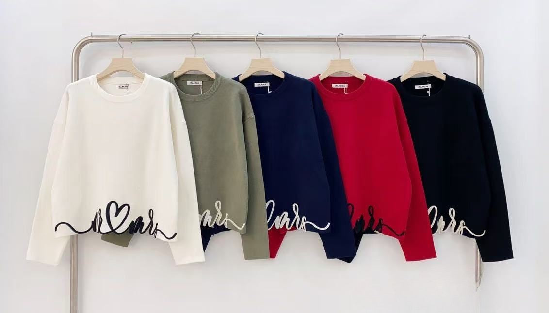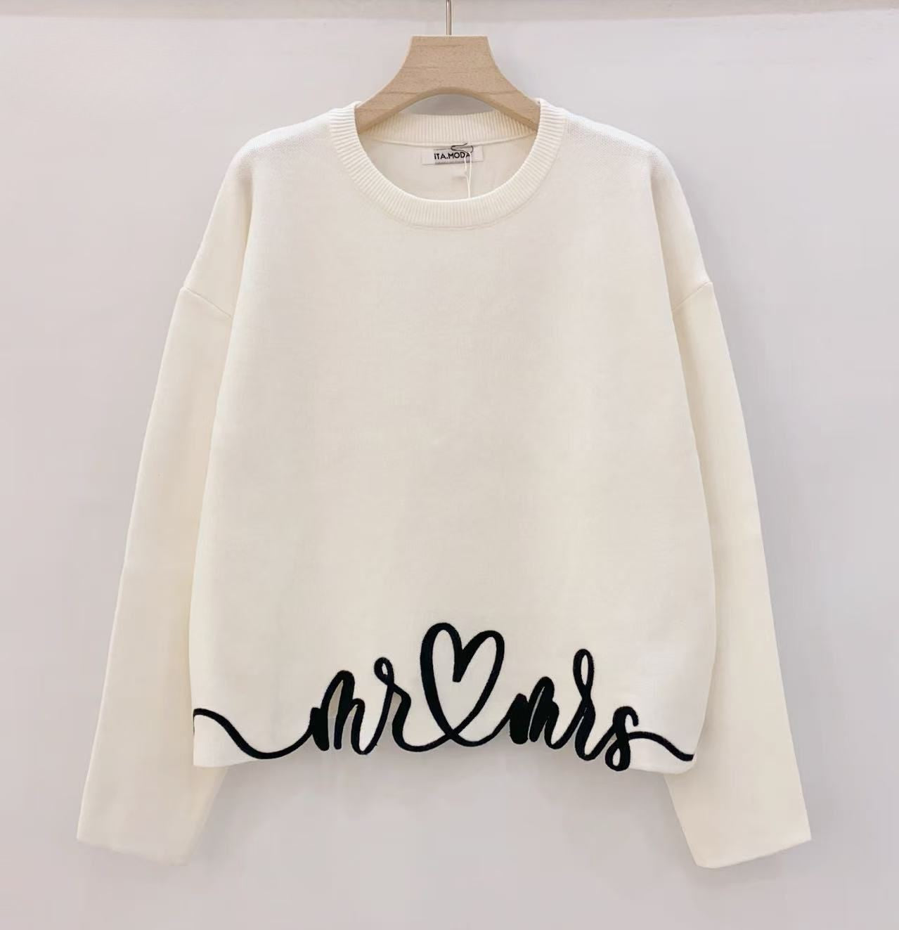 Este suéter de punto es la mezcla perfecta entre comodidad y estilo. Su diseño clásico de manga larga y cuello redondo se transforma gracias al bordado en contraste negro “Mr ♥ Mrs”, que lo convierte en una pieza con personalidad y aire romántico. Su tejido suave lo hace ideal para el día a día, combinando perfecto con jeans, faldas o pantalones de vestir para un look casual chic.