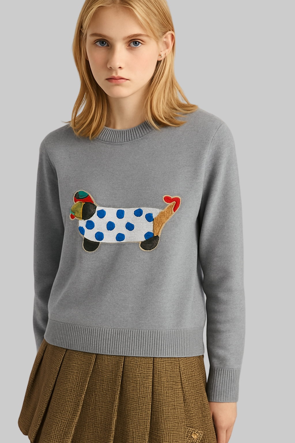 Un suéter divertido y acogedor que combina estilo y personalidad. Confeccionado en tejido suave y cálido, destaca por el bordado de un simpático perro salchicha con detalles de color que aportan un toque lúdico y único. Su tono vino lo hace fácil de combinar con faldas, jeans o pantalones neutros para un look casual con un toque de encanto. Ideal para darle un giro original a tus outfits de temporada.