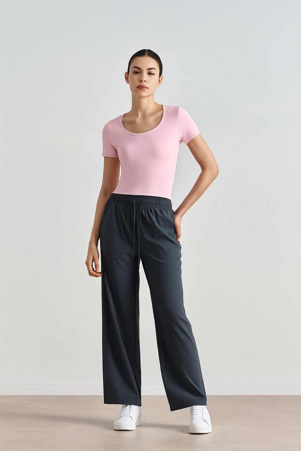 El top rosa bebé, con ajuste de compresión suave, realza la figura y ofrece máxima comodidad, mientras el pantalón amplio en tono gris brinda libertad y un toque sofisticado.