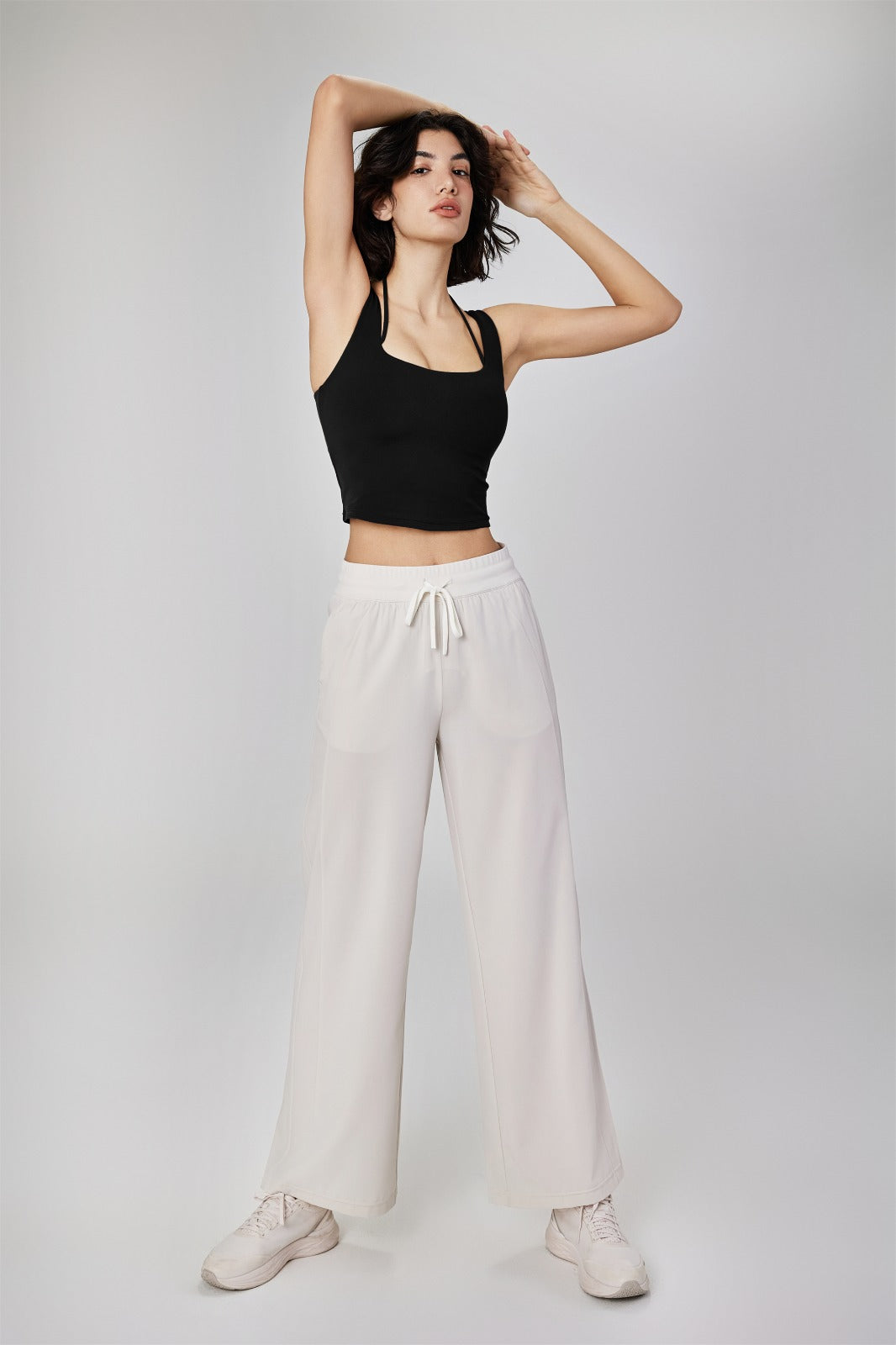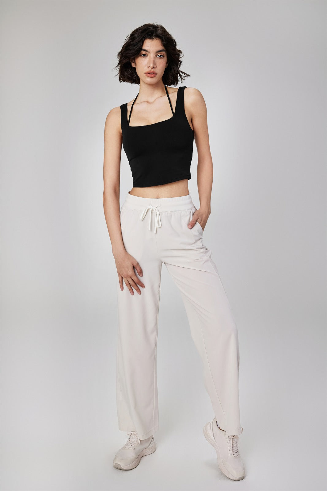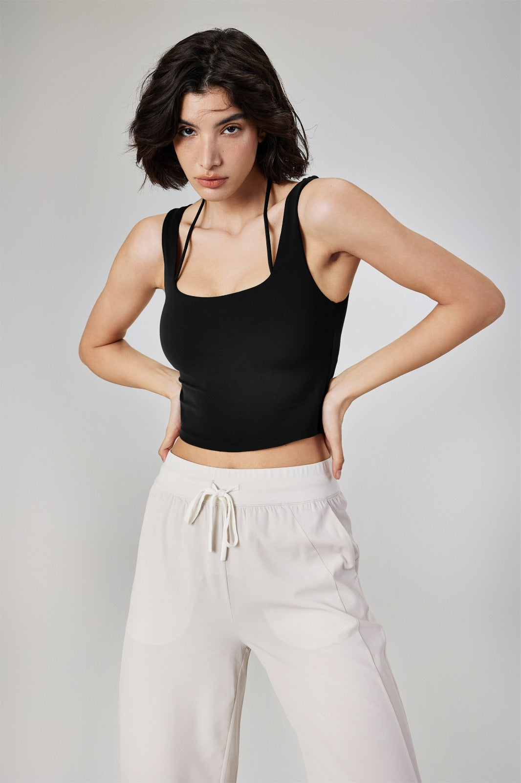 Este top negro con tirantes dobles ofrece un ajuste cómodo y favorecedor que resalta la figura. Su tejido elástico y suave lo hace ideal para combinar con joggers, jeans o leggings.